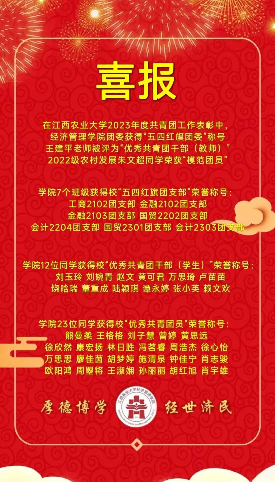 其中,BB贝博艾弗森团委荣获“五四红旗团委”;工商2102、金融2102团支部等7个团支部被评为“五四红旗团支部”;王建平老师被评为“优秀共青团干部(教师)”;2022级农村发展朱文超同学被评为“模范团员”;饶晗瑞、刘玉玲等12位同学被评为“优秀共青团干部(员工)”;熊曼柔、王格格等23位同学被评为“优秀共青团员”。