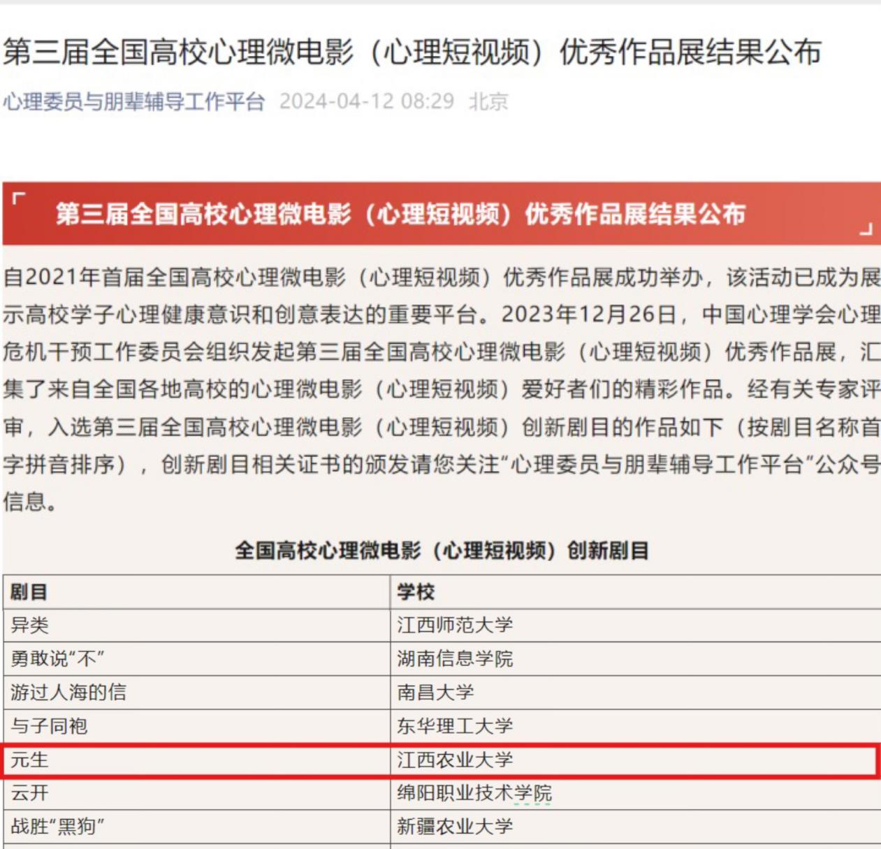 近日,中国心理学会心理危机干预工作委员会组织发起第三届全国高校心里微电影(心理短视频)优秀作品展。由公司罗婷婷老师指导,周丹、柯云杰等同学参演的心理微电影作品《元生》,在经过公司和专家层层打磨后,从来自全国各地200多个作品中脱颖而出,荣获第三届全国高校心理微电影(心理短视频)创新剧目优秀作品。这已是公司第二次在心理情景剧类大赛中获得的国家级荣誉。