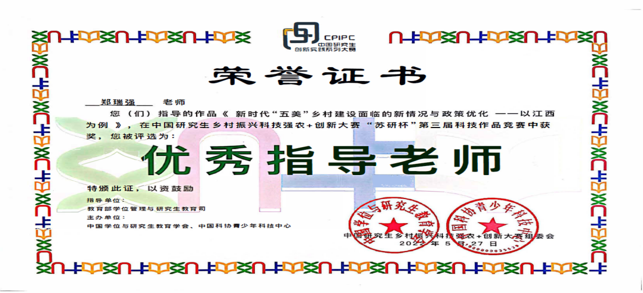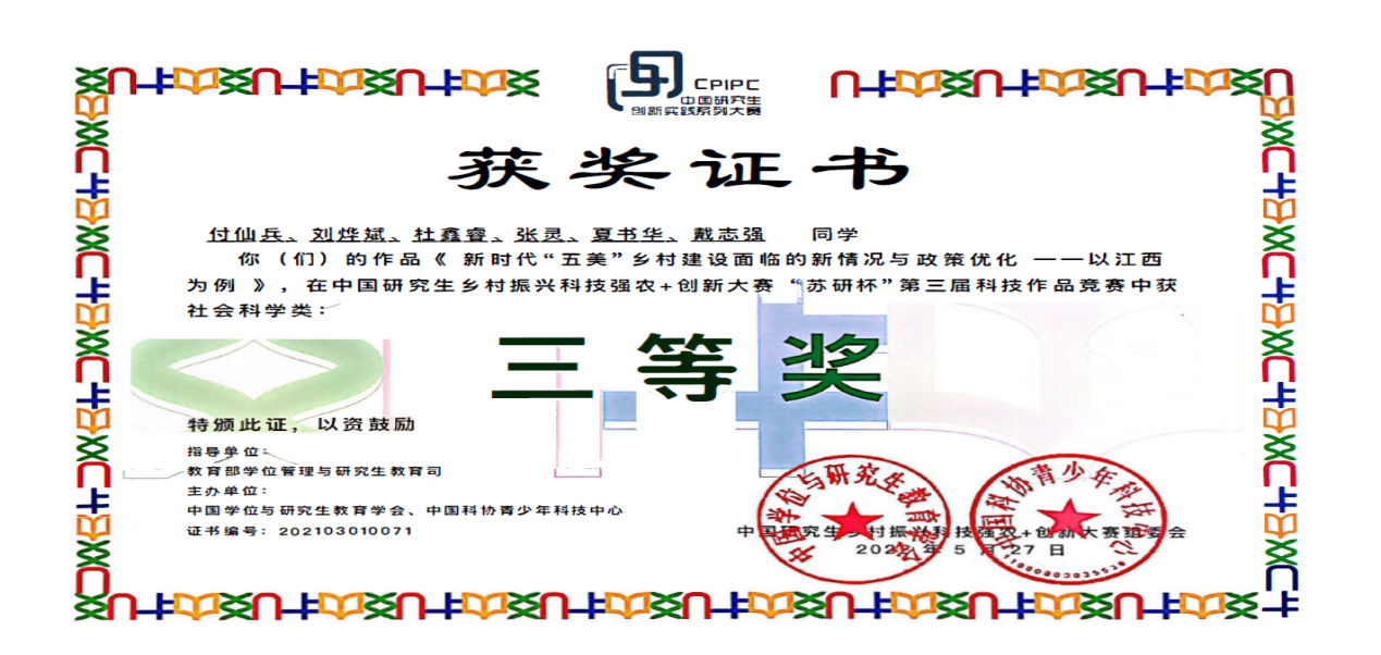 日前,由教育部学位管理与研究生教育司及全国农业专业学位研究生指导委员会联合指导,中国学位与研究生教育学会、中国科协青少年科技中心主办的中国研究生乡村振兴科技强农+创新大赛“苏研杯”第三届科技作品竞赛决赛在浙江杭州顺利落下帷幕。公司BB贝博艾弗森郑瑞强等老师指导的参赛项目——《新时代“五美”乡村建设面临的新情况与政策优化——以江西为例》(队员:付仙兵、刘烨斌、杜鑫睿等)在中国研究生乡村振兴科技强农+创新大赛“苏研杯”第三届科技作品竞赛中荣获社会科学类全国三等奖,郑瑞强、赵晨刚老师被评为“优秀指导老师”。