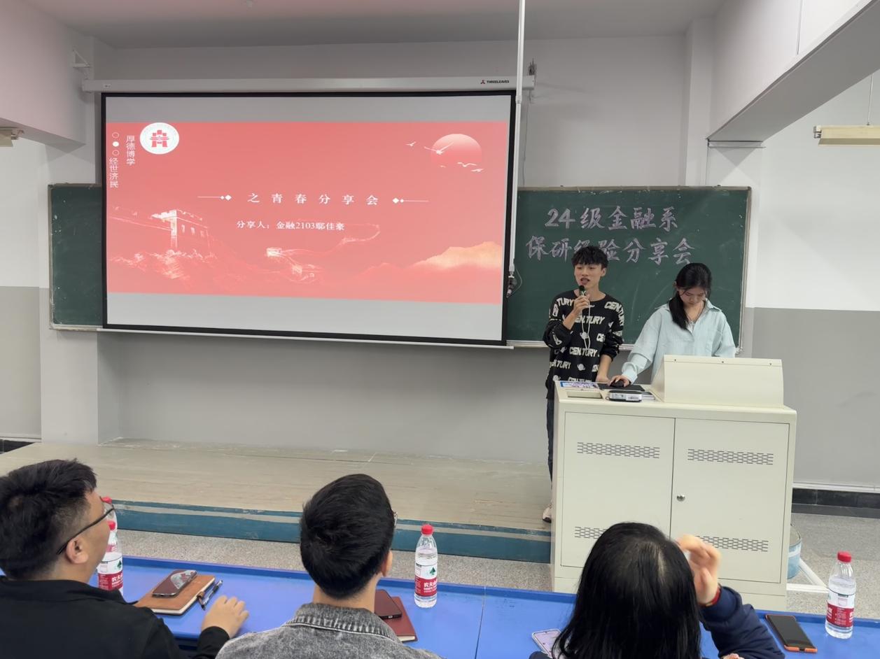 秋意渐浓,秋风送爽。为了让同学们对金融专业未来的发展方向和人生规划有更深入的认识,BB贝博艾弗森金融系于10月15日在E教515举行了“梦月湖青春分享会之保研分享会”活动,公司团委副书记王建平、学工办副主任马超、金融系班主任代表张琴、金融系保研员工代表及全体24级金融系新生参与此次活动,活动由金融2401班李雨涵同学主持。