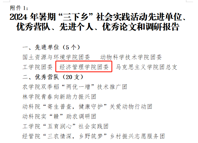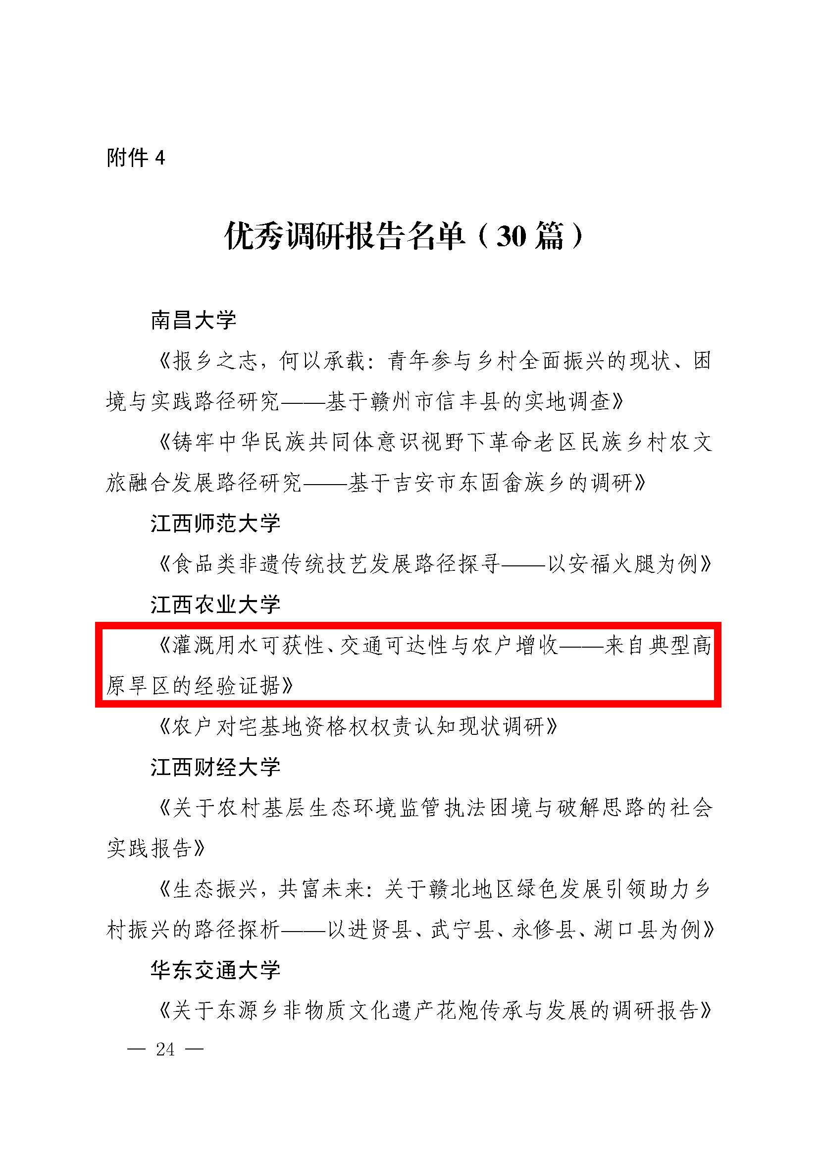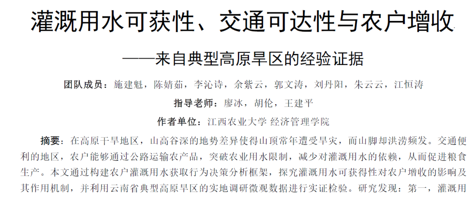 近日,江西省委宣传部、江西省教育厅、共青团江西省委、江西省学联联合下发《共青团江西省委等四部门关于2024 年江西省大中专员工志愿者暑期“三下乡”社会实践活动的通报》(赣青联发〔2024〕28号)中,公司农林经济管理2103班施建魁等同学撰写的调研报告《灌溉用水可获性、交通可达性与农户增收——来自典型高原旱区的经验证据》(指导老师:廖冰、胡伦、王建平)荣获省级优秀调研报告。