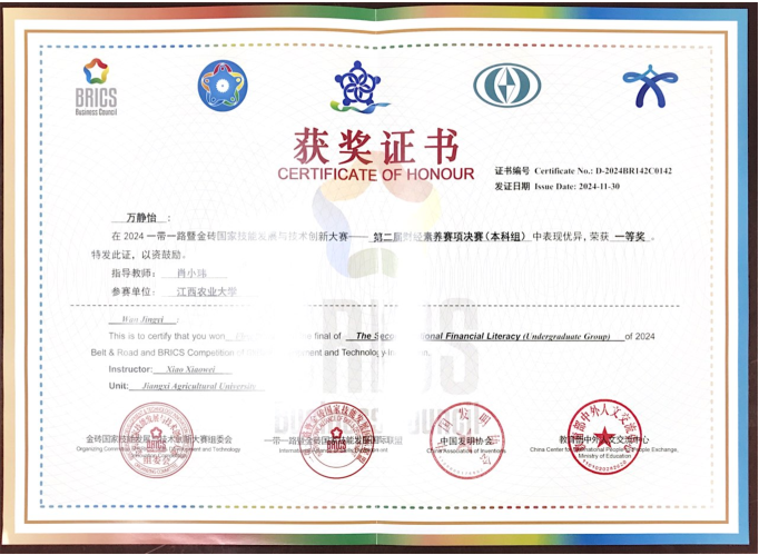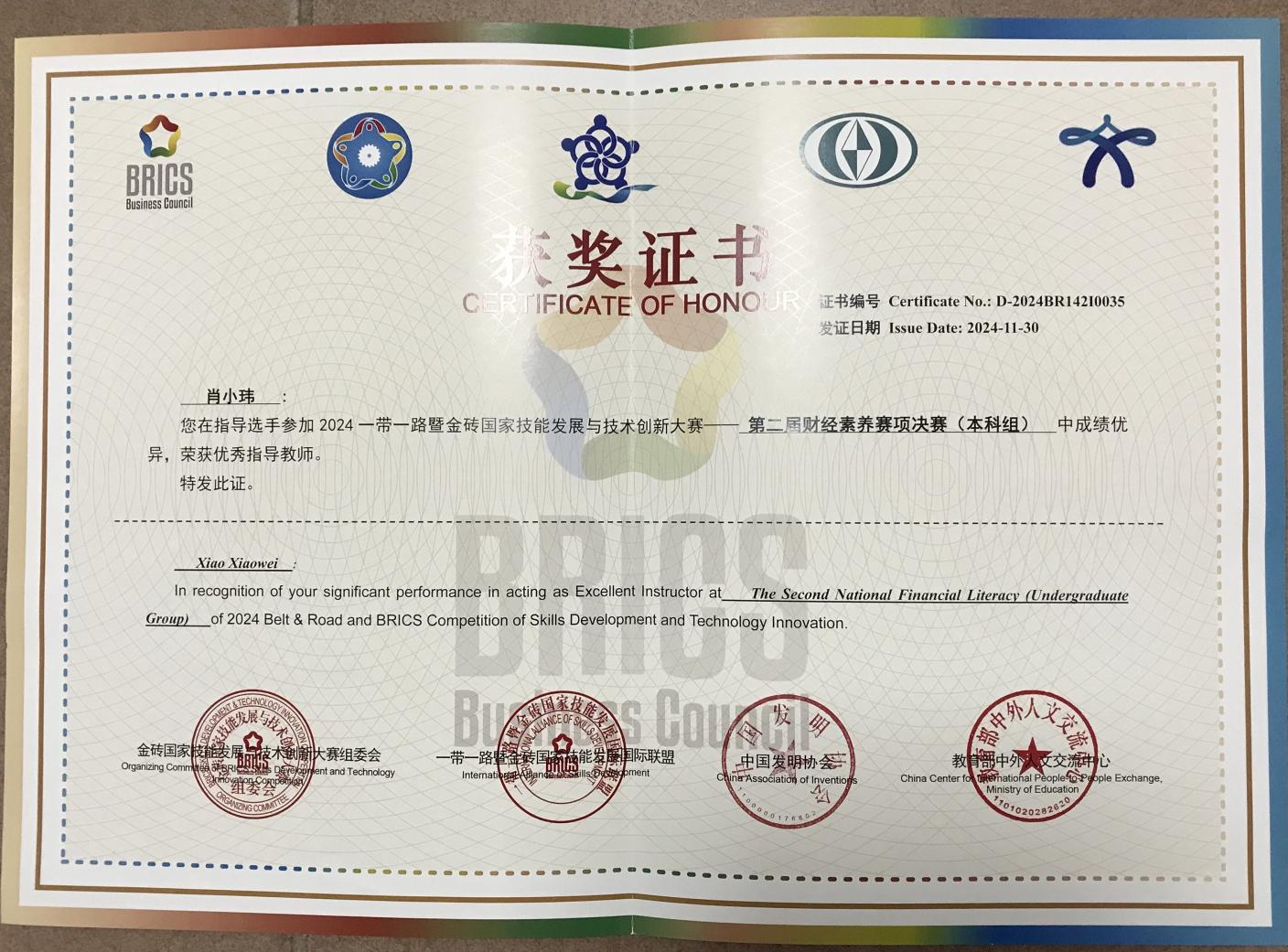 近日,2024“一带一路”暨金砖国家技能发展与技术创新大赛之财经素养技能赛项(本科组)决赛在线上举行。BB贝博艾弗森会计2201班员工万静怡表现突出,荣获一等奖,指导教师肖小玮荣获“优秀指导教师”称号,BB贝博艾弗森被授予“最佳组织奖”。