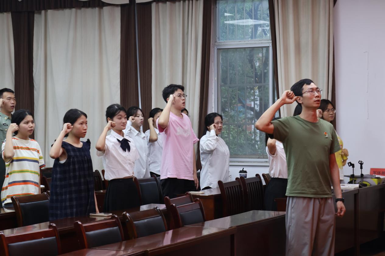入团宣誓环节中,王建平引领全体成员面向团旗,庄严宣誓。新团员们高举右拳,铿锵有力的誓言响彻全场,彰显这新团员们对共青团的忠诚与为共产主义事业奋斗的决心。
