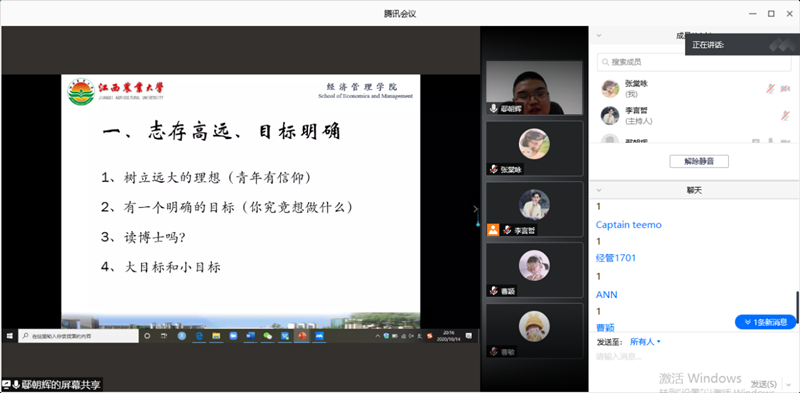 18级鄢朝辉同学,是公司2020年度研究生国家奖学金获得者,他从明确目标、找准定位、精准发力等三个部分进行分享。作为过来人,他表示,找准定位非常重要,而对大家而言,本校本院就是很好的选择。希望同学们能尽早规划好未来的道路,以梦为马,不负韶华。