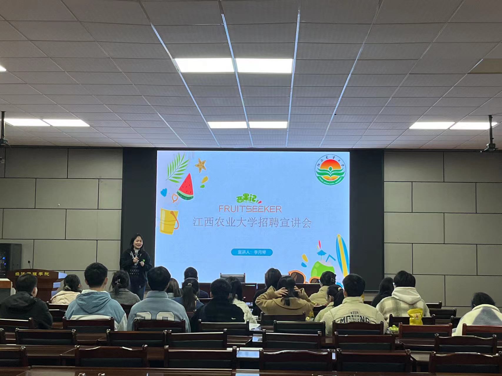 11月13日晚19:00,公司于经世楼207室成功组织召开广东西果记农业发展有限公司宣讲会,本次宣讲会由该公司HR李月琴主讲。