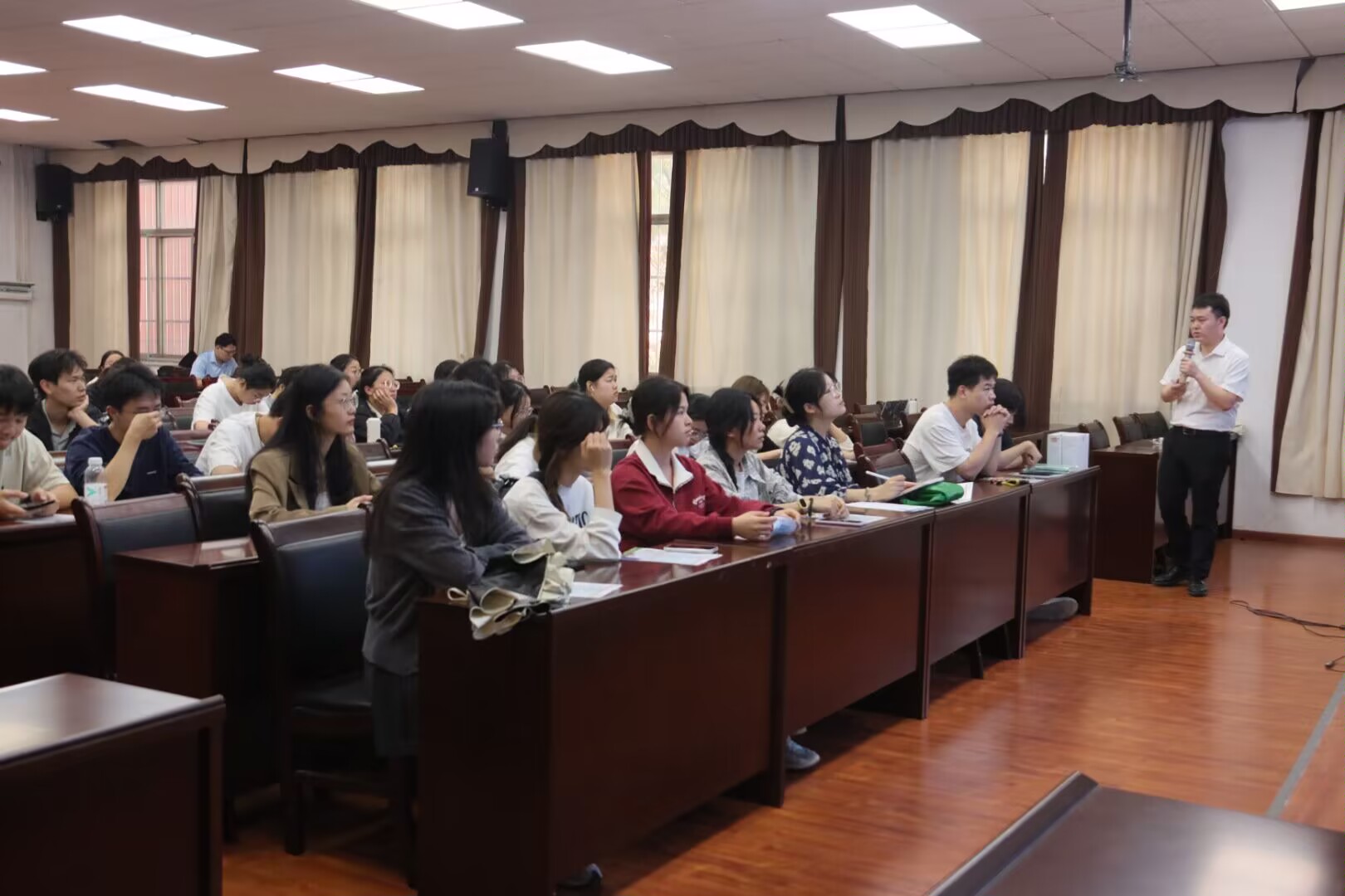 会议伊始,刘经理就该公司的发展历程和未来愿景做了简要介绍,让在座毕业生们了解到公司的未来发展方向和人才需求。紧接着,刘经理通过阐述公司招聘岗位的具体要求,进一步加深在座毕业生们对公司招聘计划的了解,有利于提高“人才-岗位”适配度。同时,他强调如有对营销、采购、财经和人力资源部门感兴趣的毕业生们可以积极参加面试活动。最后,刘经理积极为在座毕业生们答疑解惑,并诚挚邀请大家投递简历。