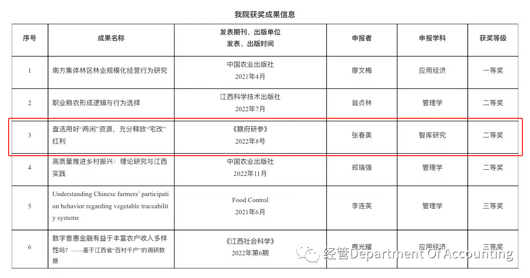 近日,江西省社会科学界联合会公布了第二十次社会科学优秀成果奖获奖名单,公司MPAcc导师张春美教授申报的智库研究成果《盘活用好“两闲”资源,充分释放“宅改”红利》荣获二等奖,该项成果的成员还包括会计系吴文军副教授、农业农村厅四级调研员明经结以及会计学硕士研究生罗泽霖、曹冠乔、胡玲。