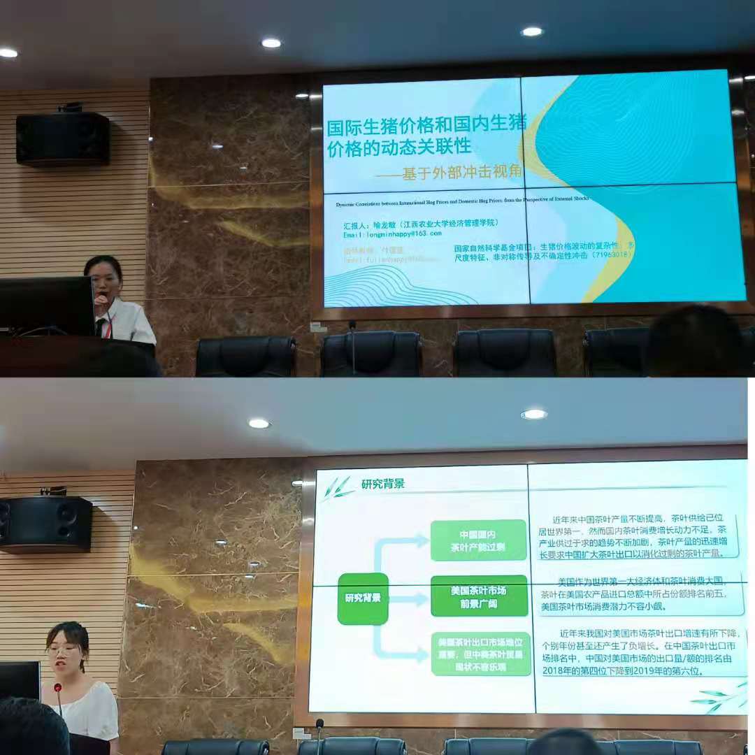 胡冰川、高鸣和曾福生三位农业经济专家在会议上做了相关主旨报告。会议从众多投稿论文中筛选出20多篇论文作为分论坛报告论文。喻龙敏学员的论文《国际生猪价格和国内生猪价格的动态关联性——基于外部冲击视角》入选,在“生猪价格与农产品出口”分论坛进行了会议报告,接受了与会专家的点评指教,并就相关热点问题与在场学者进行了深入的探讨。进一步拓展学术研究领域和学术交流,发掘不同的创新视角,体现出公司研究生在学术的规范性方面提升颇大。