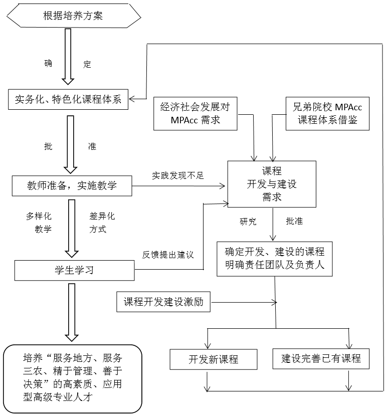 围绕MPAcc人才培养目标,着眼时代发展和专业前沿,综合任课教师教学实践及员工反馈建议,借鉴兄弟院校课程设置,由任课教师或该课程模块团队成员提出开发、建设需求,提交课程模块团队讨论,以项目的形式,报会计硕士专业学位教育工作指导小组研究批复。