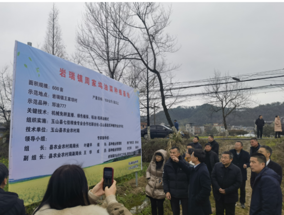 调研组一行先后来到妼姆镇鸿盛种植专业合作社、玉山县七佳粮食专业合作社联合社、岩瑞镇周家坞油菜种植基地实地考察油菜种植情况,与相关负责人了解高标准农田建设和稻油轮作等相关情况,并对七佳农民专业合作联社在岩瑞、四股桥、下镇等9个乡镇53个村集体经济组织签订农业社会化服务托管协议,服务粮油面积4万亩,涉及小农户2万余户,占全县社会化服务面积的35%,调研组给予充分肯定。