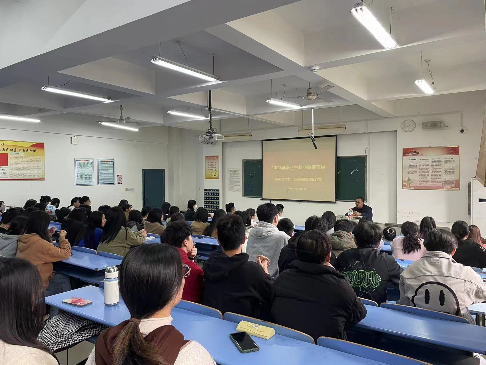为促进公司2024届联合培养毕业生了解就业政策,增强就业意识,推动顺利毕业,实现高质量就业,助力公司2024届毕业生就业工作取得实效。11月15日下午,公司党委副书记赵刚带队前往江西旅游商贸职业公司为2024届联合培养专升本会计学专业89名毕业生做就业政策宣讲。