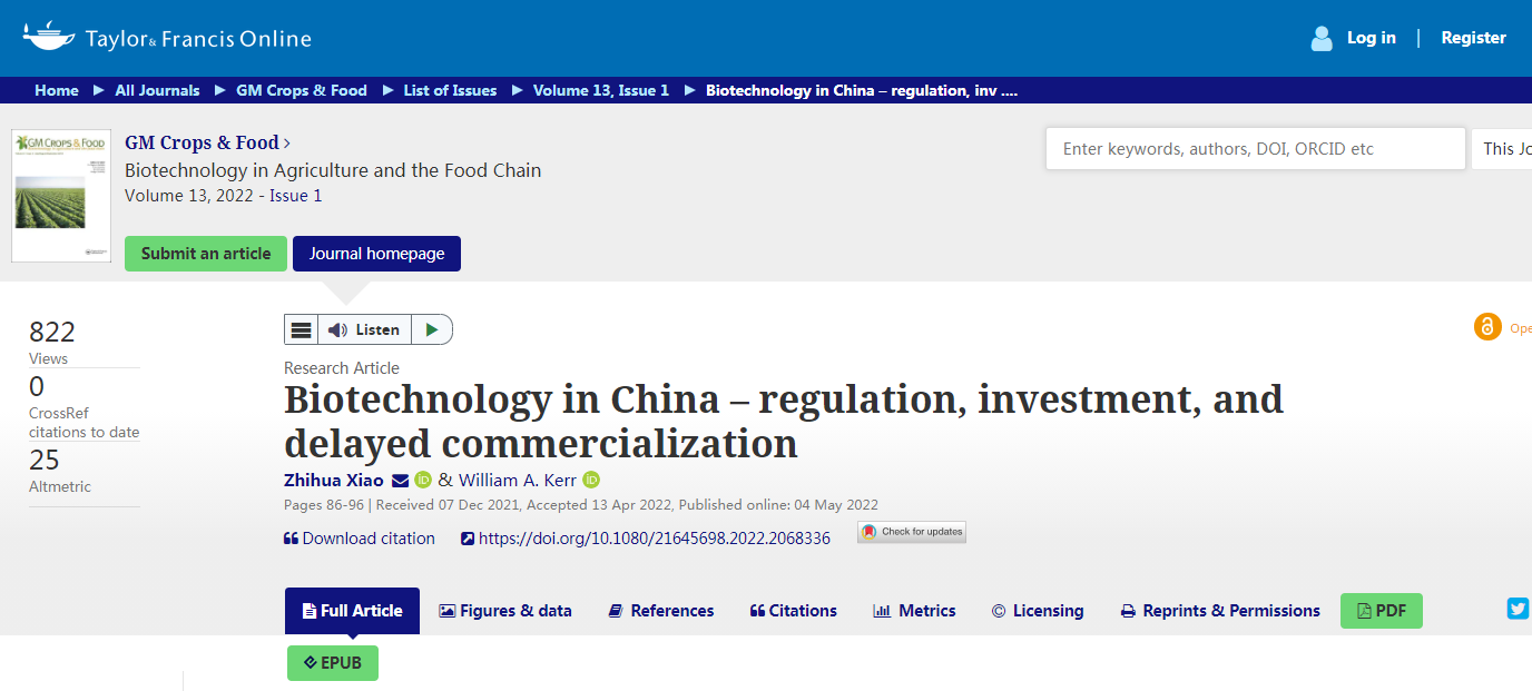 近期,BB贝博艾弗森教师肖智华博士以第一及通讯作者身份在国际权威期刊《Food and Energy Security》和《GM Crops & Food》上发表学术论文2篇,题目分别为“The Political Economy of China’s GMO Commercialization Dilemma(中国转基因商业化困境的政治经济学分析)”、“Biotechnology in China – Regulation, Investment, and Delayed Commercialization(中国生物技术——制度、投资与商业化延迟)”。第一篇文章是首个运用新政治经济学理论对中国转基因商业化困境的形成机理进行的研究。第二篇文章从制度设计、研发投资和商业化三个维度系统分析了过去40年中国生物技术和制度的发展路径并与欧洲和美国的情况进行了对比。