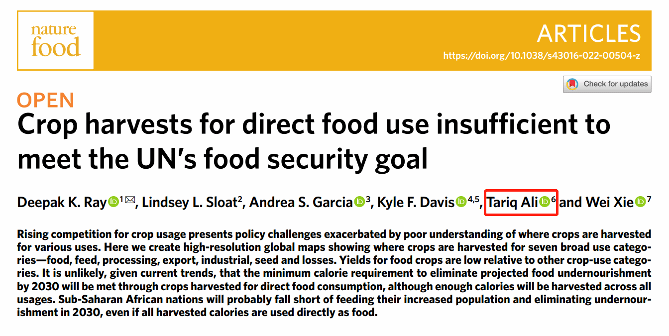 近日,BB贝博艾弗森Tariq Ali教授合作研究成果《Crop harvests for direct food use insufficient to meet the UN’s food security goal》在Nature子刊《Nature Food》上发表。美国明尼苏达大学环境研究院Deepak K. Ray教授为论文第一作者和唯一通讯作者。该研究绘制了七个最终用途的作物收成图,发现直接用于粮食的作物收成不足以满足联合国可持续发展目标,即到2030年保障人人享有粮食安全。