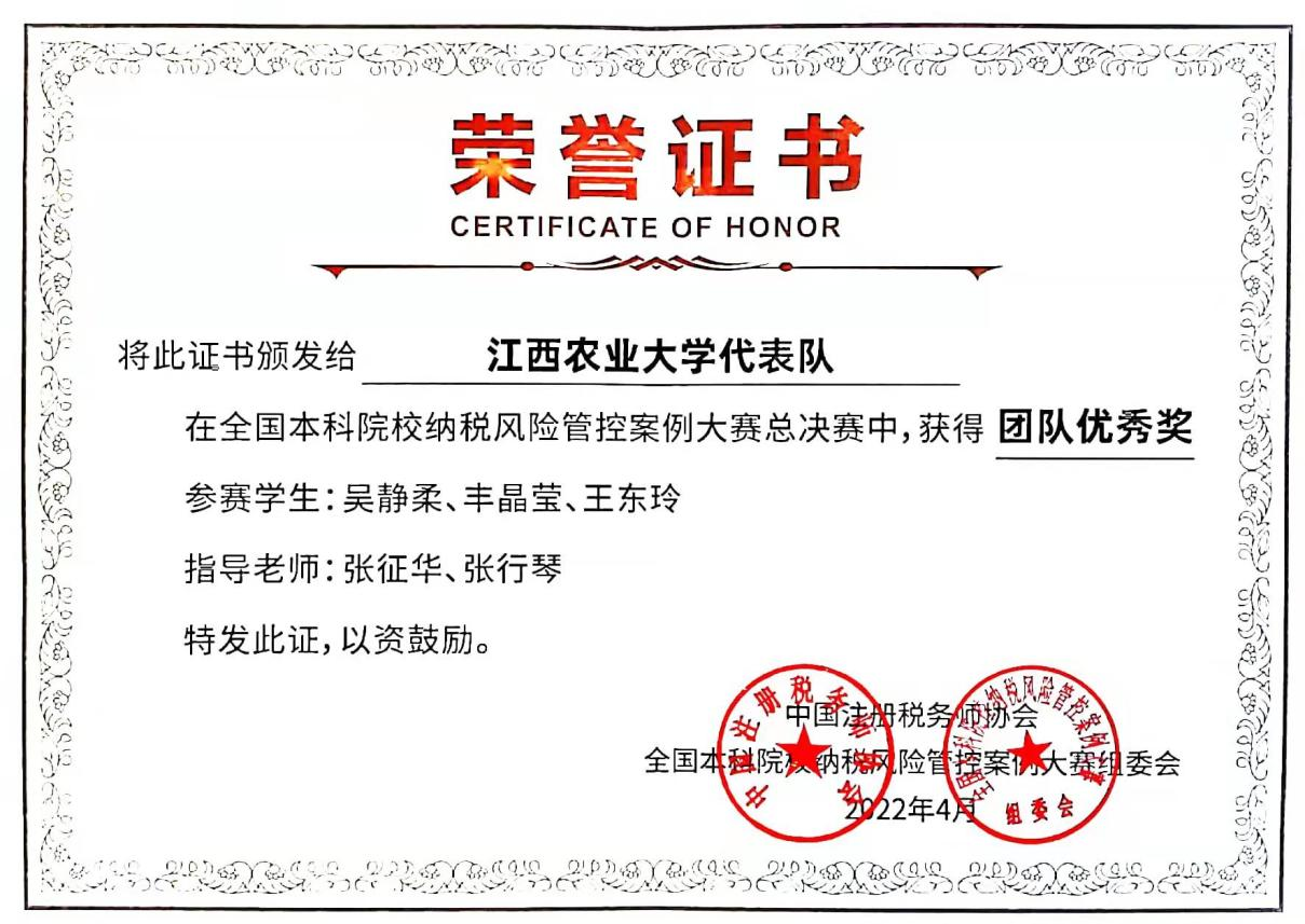 2022年4月15日,由中国注册税务师协会主办,国家税务总局纳税服务司、教育部高等公司财政学专业教学指导委员会、中国高等教育学会高等财经教育分会指导,各省、自治区、直辖市和计划单列市和注册税务师协会承办的全国本科院校纳税风险管控案例大赛总决赛落下帷幕。由公司会计1903班吴静柔、会计1902班丰晶莹、会计1902班王东玲三位同学组成的参赛队伍在公司教师张征华教授和中汇税务师事务所张行琴副总的共同指导下荣获全国总决赛优秀奖。
