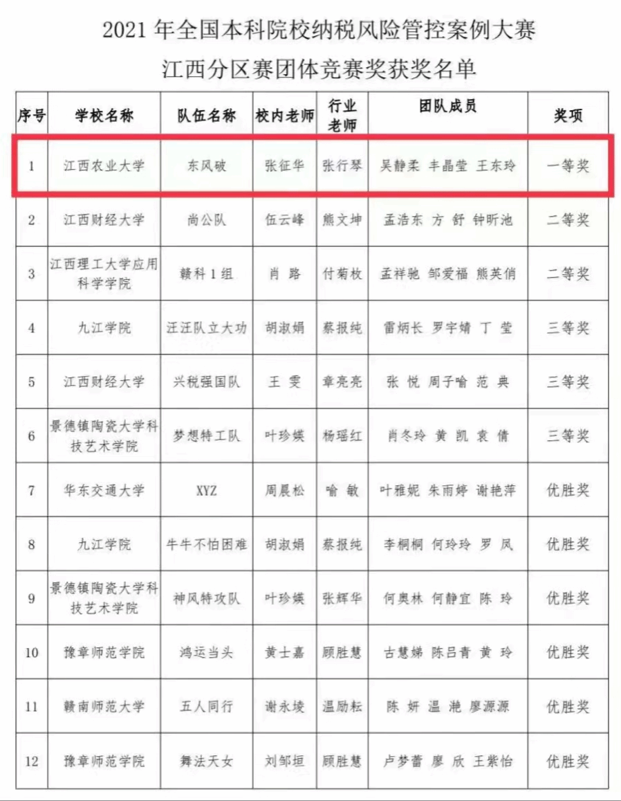 据悉,全国本科院校纳税风险管控案例大赛旨在推动税法知识进校园,促进税务师行业与高校产教融合,持续提升财税教学改革与实践水平,激发老员工学习财税知识的兴趣,培养员工解决问题的能力。江西省分区赛于2021年12举行,共有20所本科类高校报名,每所高校限晋级2支队伍,共40支队伍参赛。比赛分两个环节举行,第一环节为税法知识测试,第二环节为案例分析。大赛设置一等奖1名,二等奖2名,三等奖3名,优胜奖6名。