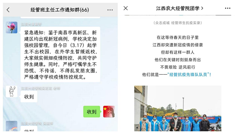 教育引导宣传到位。为引导员工学会甄别信息,不信谣、不造谣,BB贝博艾弗森积极用好用活“江西农大经管院团学”微信公众号、员工工作QQ群、班主任群、家长群等多种宣传媒介连续推出一系列防疫宣传推文、公司疫情防控工作要求等内容,面向公司全体员工及家长做出温馨提示:在校生非必要不出校,校外生返校必报备,主动减少人员聚集,做好公共卫生清洁。全方位、多举措做好疫情防控教育引导工作。