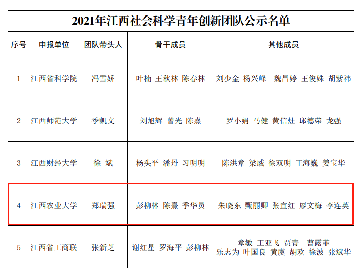 2021年12月30日,江西省社会科学界联合会发布关于成立江西社会科学青年创新团队的通知,公司省级社科团队建设实现突破,郑瑞强副教授领衔,廖文梅教授、李连英副教授参与的团队成功入选2021江西省社会科学青年创新团队,成为仅有的5个入选的省社科青年创新团队之一。