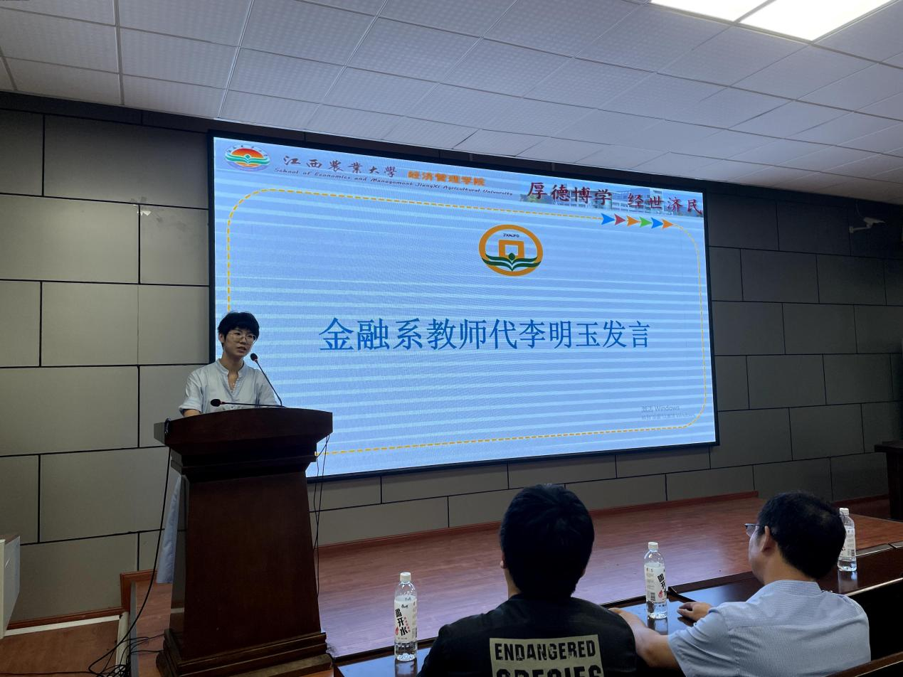 金融系教师代表李明玉讲述了自己对金融学专业的理解。她代表金融系全体教师表示,作为一名高尚的人民教师,将不忘立德树人初心,牢记为党育人、为国育才使命,为同学们的成长与发展不断奉献。