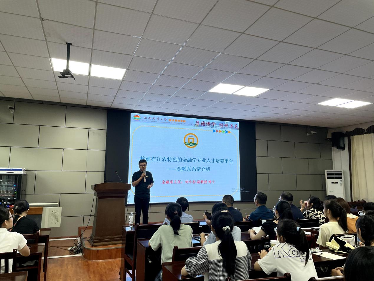 金融系主任刘小春老师就系情作了介绍,并就金融系的办学历史、育人理念、实践平台、团队队伍、教学改革、科学研究、育人成效等七大方面进行了全面介绍。