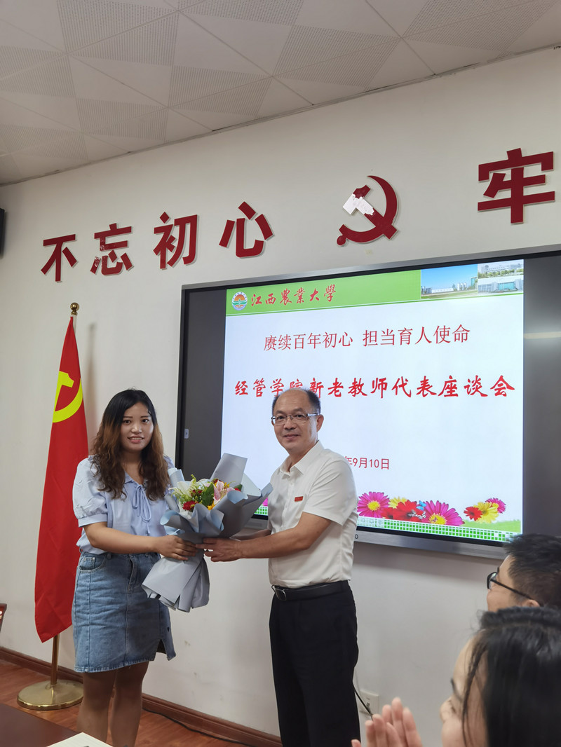 会议伊始,新入职教师代表为从教30年教师代表献花。与会人员集体学习了习近平总书记给全国高校黄大年式教师团队代表回信精神和省委书记刘奇在南昌与全省优秀教师代表座谈会精神。