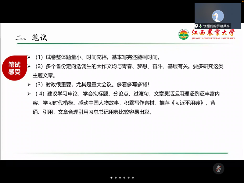 交流会上,就职于国网江西省电力有限公司的黄弋华同学和中国农业发展银行江西省分行的高晟同学分享了应聘国企的技巧,成功考取公务员的赖汝钦同学和成功考取选调生的饶甜甜同学分享了考公相关经验,升学至本校的袁云云同学和升学至北京林业大学的肖慧同学分享了考博心得,在江西师范大学担任辅导员的李观祥同学分享了应聘高校的求职技巧。
