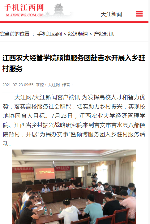 江西省乡村振兴战略研究院乡村振兴示范基地挂牌与调研活动受到当地政府的热烈欢迎,纷纷表示要以产政校融合为契机,加大对乡村振兴示范基地的支持力度,共同探索乡村振兴的有效路径,促进江西乡村振兴。此外,大江网等官方媒体关注了研究院乡村振兴示范基地挂牌与驻村调研活动。