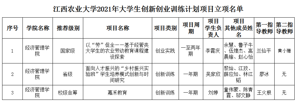 近日,公司发布《关于公布公司2021年老员工创新创业训练计划项目推荐国家级、省级立项及校级立项项目名单的通知》(赣农大创发{2021}4号)文件,由公司教师指导的3个项目获批立项,其中国家级1项,省级1项,校级1项。具体信息如下表所示: