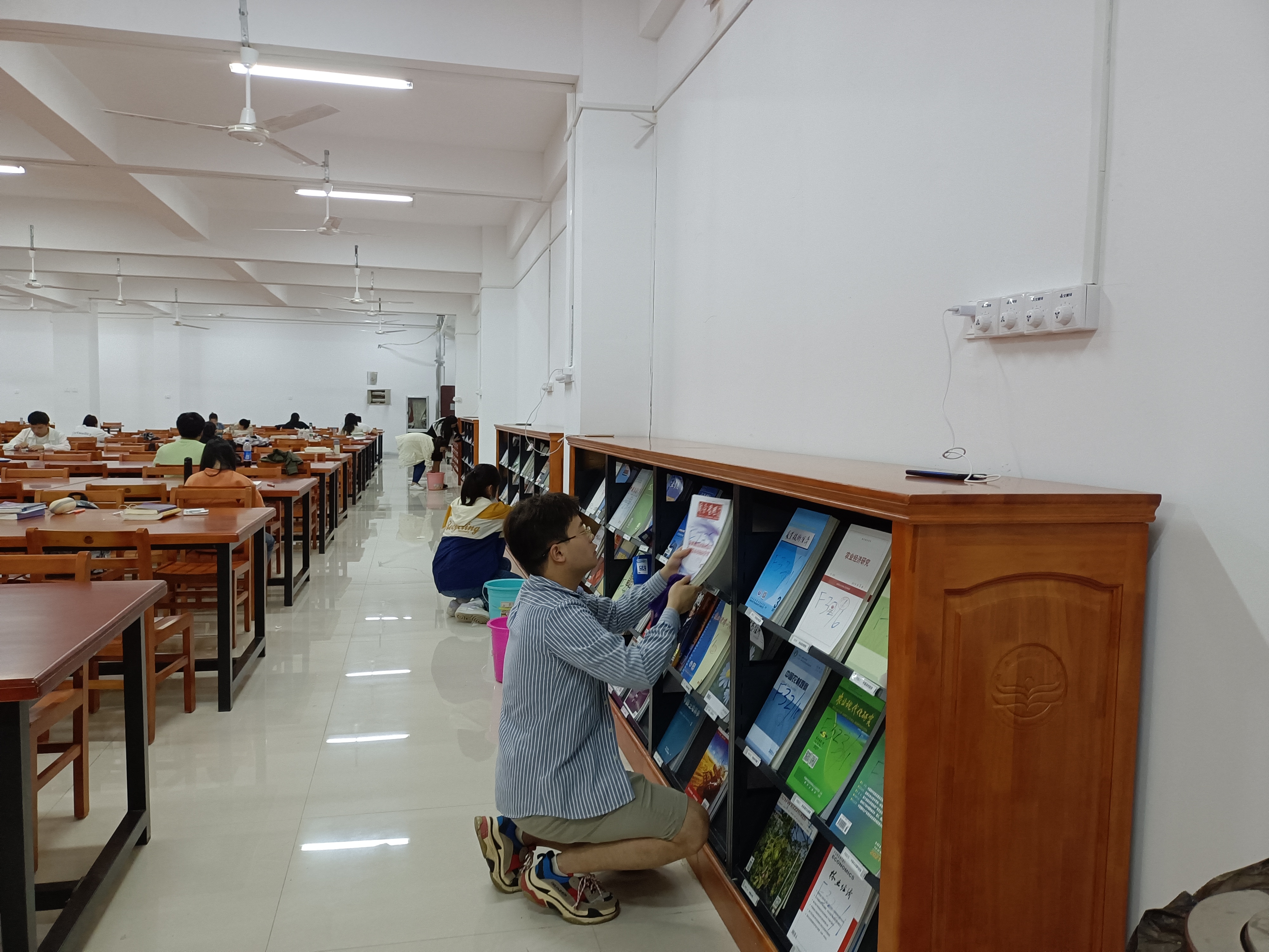 活动开始,支部书记曹欢带领支部党员于东区图书馆集合,经过与东区分馆主任王小雄沟通,安排员工党员清洁图书馆期刊柜和整理图书架。活动中,支部党员们拿着清洁工具前往图书馆二楼期刊自习室认真仔细地擦拭期刊柜,在分馆主任指导下,有序地将图书馆四楼图书进行分类摆放整齐,为全体同学营造一个更加整洁的阅读和学习环境。在长达一个小时的活动过程中,全体党员始终保持安静,不影响在图书馆自习的同学。