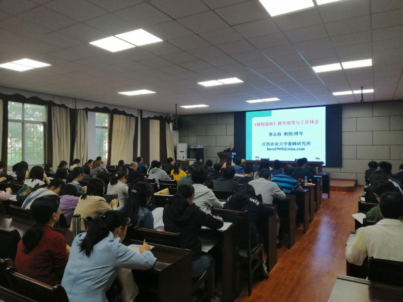 曾志将教授首先以《养蜂学》课程为例,分别从东方蜜蜂特性分析中融入中国人勤劳、勇敢、节俭等传统美德,从蜜蜂作用分析中融入习近平总书记“两山理论”、“精准扶贫”等重要理念,从蜜蜂团队合作中融入政治意识、大局意识、核心意识和看齐意识。接着,他分享了自己1987年大学毕业来公司后是如何在无教学蜂场、无实验室、无团队的“三无”情况下,守初心、担使命、开新局的工作经历和切身体会,并对教师们提出三点希望:一是要有稳定的研究方向,制定好中长期研究计划,不断拓宽自己的知识面;二是要有攻坚克难的毅力恒心,组建齐心协力的研究团队;三是要有对平台对公司的感恩之心,发扬好主人翁精神。