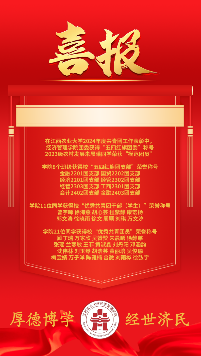 其中,BB贝博艾弗森团委荣获“五四红旗团委”;金融2201、国贸2202团支部等8个团支部被评为“五四红旗团支部”;2023级农村发展朱晨曦同学被评为“模范团员”;曾宇晞、徐海燕等11位同学被评为“优秀共青团干部(员工)”;顾丁瑞、万家欣等22位同学被评为“优秀共青团员”。