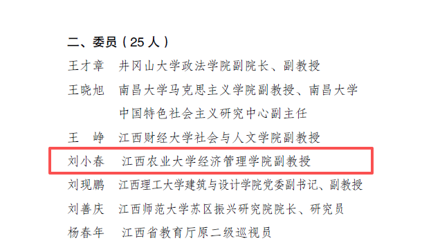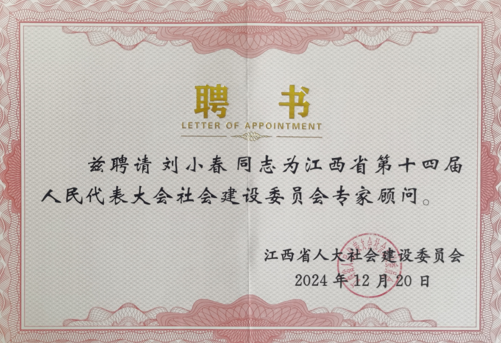 此外,刘小春副教授还于2024年获聘江西省十四届人大社会建设委员会专家顾问,凸显其在社会建设领域的影响力。