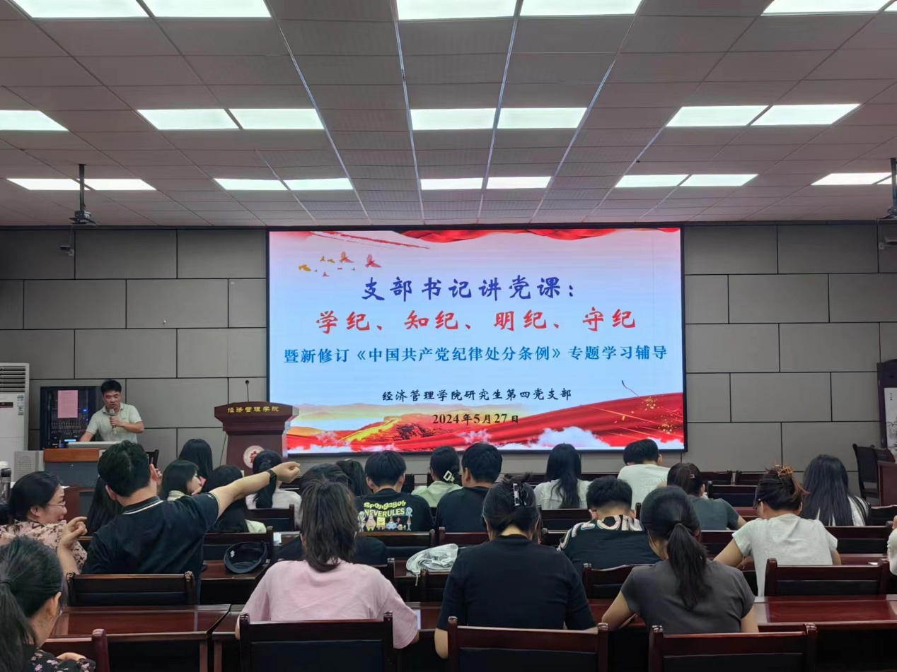 为进一步加强党员的纪律观念和党纪意识,提高党员的党规党纪素养。5月27日晚,经管院研究生第四党支部与经世楼207召开主题为“学纪、知纪、明纪、守纪暨新修订《中国共产党纪律处分条例》专题学习辅导”的党支部书记讲党课活动。此次会议由党支部书记廖冰主持,研究生四支部全体党员参与。