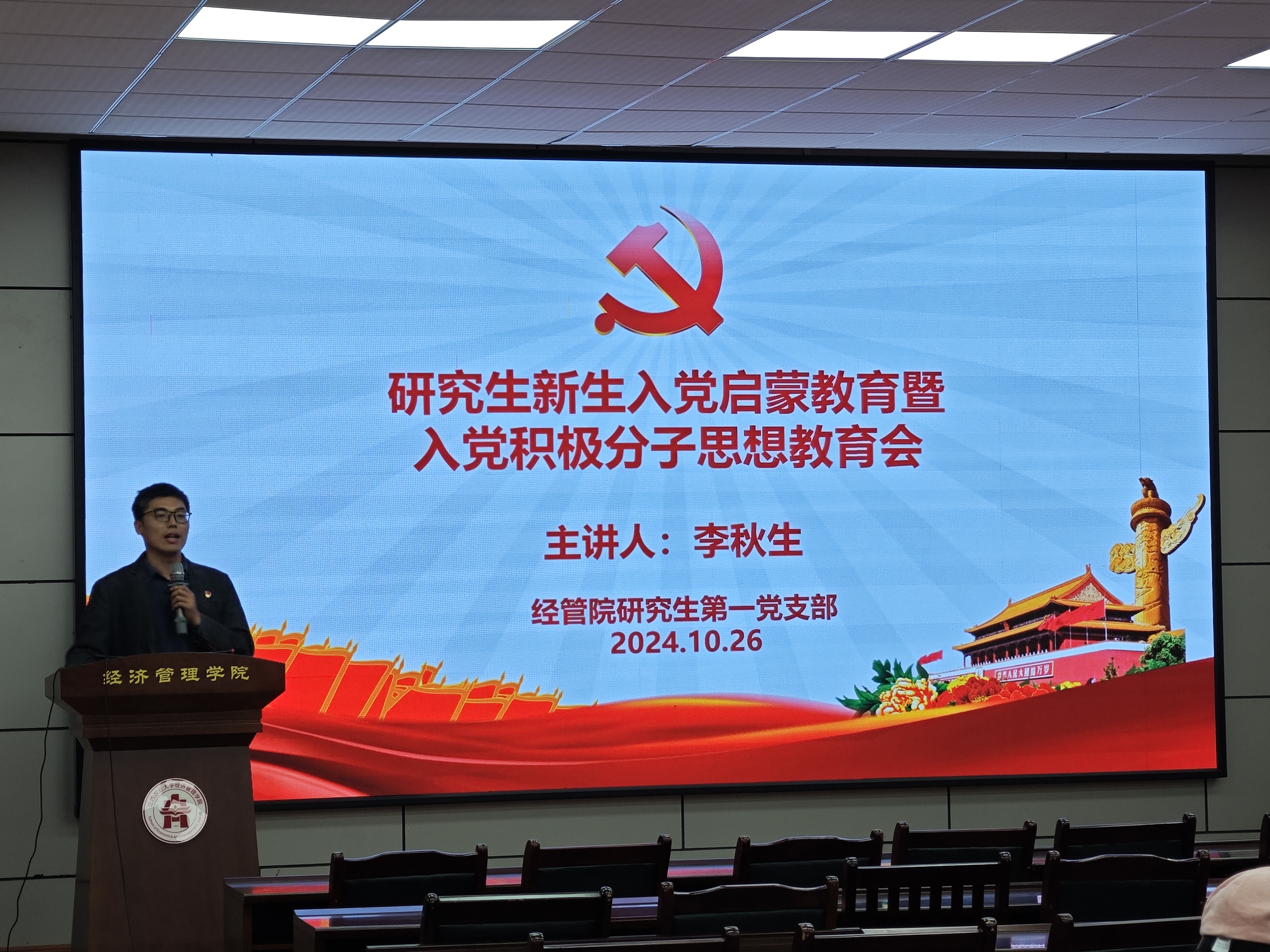 为引导研究生新生积极向党靠拢,加强员工对党的认识和理解以及熟悉入党流程,10月26日下午,研究生第一党支部在经世楼207举行研究生新生入党启蒙大会。会议由支部书记李秋生同志主持,支部党员、入党积极分子以及入党申请人参与。