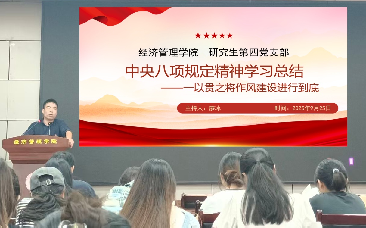会议伊始,支部2025级硕士生、博士生党员围绕个人基本情况、学习科研经历及加入党支部感受体会等依次上台自我介绍。紧接着,支部组织委员陈佳慧同志带领全体党员重温了中央八项规定的具体内容及其重大意义。最后,廖冰同志汇报了自深入贯彻中央八项规定精神学习教育启动以来支部所开展的活动、所做的工作、所取得的成效、还存在的问题以及下一步的规划打算等。