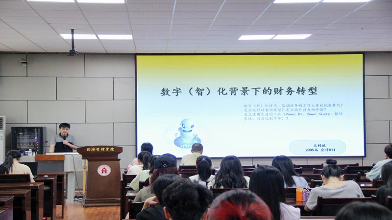 9月27日上午,公司于经世楼207会议室成功举办以“数字(智)化背景下的财务转型”为主题的专题讲座。本次讲座由公司2005届会计学专业优秀员工王利斌主讲,150余名师生到场聆听。