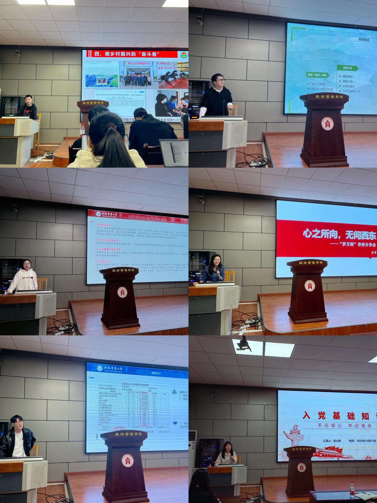 江西省硕士研究生“十佳实践之星”姜懿鑫以“以梦为马,不负韶华”为题,从干部经历、扶贫支教两方面分享了自己的经验,并鼓励同学们在学习之余多参加社会实践,提升自己的实践能力,增强社会服务意识;BB贝博艾弗森研究生会主席朱文超从求职注意事项和读研规划两方面作出分享,强调简历要突出自身优点、内容要具有针对性,求职过程中要端正好求职态度,读研期间要有清晰目标,鼓励同学们要勤于思考;国家奖学金获得者袁若兰、邹佳敏、汪振依次从学术论文写作、参赛经历、课程学习三方面作出分享,并重点强调了论文选题的重要性、学术竞赛的技巧性及理论学习的方法性;研究生第三党支部秘书张小英分别从研究生支部情况、入党流程及自身入党感悟等方面进行分享。