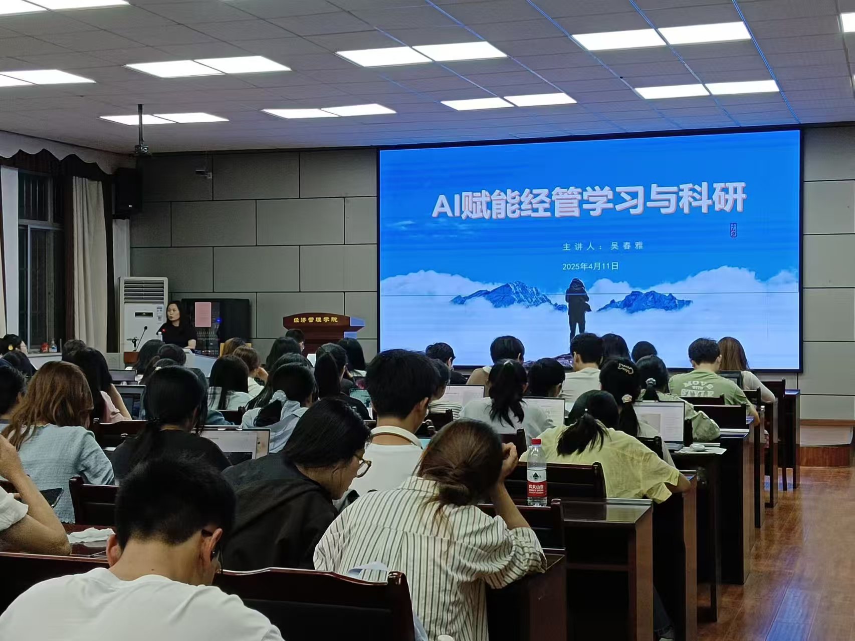 会上,吴春雅副教授围绕“AI赋能经管学习与科研”主题,从AI工具最新发展、赋能学习实践方法以及为员工提供具体学习建议等多方面,详细阐述如何借助人工智能提升学习效率与质量。活动现场气氛热烈,学术氛围浓厚,同学们受益匪浅。