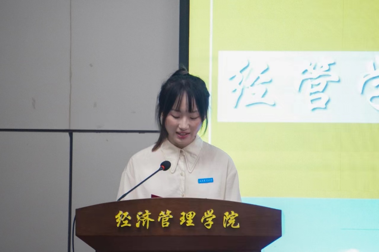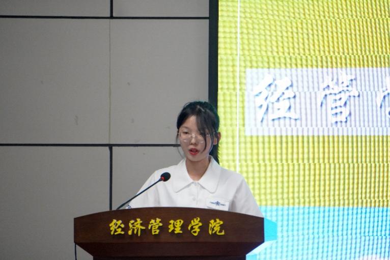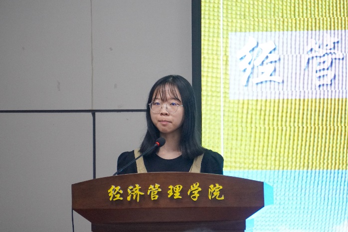 来自金融2101班的老生代表胡梦婷同学也向本届新生分享了自己两年学习的心得,希望新同学们在大学里不要随波逐流,与其徒增焦虑,不如走好眼前的每一步,在没有明确的目标前认清并接纳自己的迷茫,保持求知的热忱,树立主动学习的观念。强调主动学习的重要性后,胡梦婷分享了自己的学习经验,推荐新同学们养成记笔记的习惯,形成自己的知识框架,专业学习的同时提高英语素养,辅以网课学习,通过各类赛事进行输出,形成学习循环。