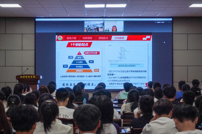 已保研至中山大学的2022届毕业生李晴枫学姐以线上形式发言,分享了本科四年一路走来的经验和心得。李晴枫学姐以学弟学妹的视角,从精神、学习、工作三方面梳理了可能遇到的种种困难,教同学们用同侪效应提升归属感、用“优先级”概念将时间模块化。李晴枫用“人生等式”,即人生结果=思维模式×努力程度×个人能力+随机误差,告诉新同学们技巧只能锦上添花,依然要久久为功,习惯坐冷板凳,在坐中静、舍中得、事上练。在感谢金融系培养平台、各科老师帮助的同时,李晴枫也感谢自己在大学四年慎终如始,有流不完的汗、用不完的勇气,用亲身经历告诉同学们“严于律己,天道酬勤”!