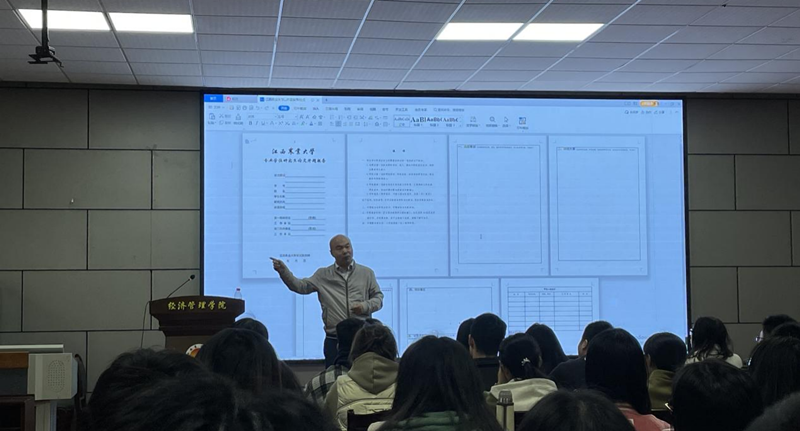 讲座上,郑老师以论文的选题依据、研究方案、研究基础为主线展开论述。首先,在论文开题的选择上,郑老师强调既要注重选题的范围与选题的新旧程度,又不能忽略选题的前沿动态性与创新性。其次,在文献综述的撰写上,郑老师为同学们在文献综述中出现的“不够”、“不全”、“不准”三大问题提出了“多研读”、“敢放弃”、“广搜索”的具体解决对策。最后,郑老师对优秀论文的框架结构作出详细讲解,并对员工写好开题报告寄予了殷切期望。