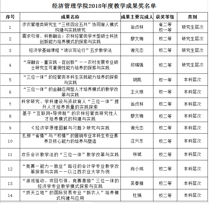 今年7月,江西省教育厅公布了第十六批江西省高校省级教学成果奖名单,我院获省级二等奖1项。另据《关于公布2018年校级教学成果奖名单的通知》(赣农大教发【2019】23号)和《关于公布2018年校级研究生教学成果奖名单的通知》(赣农大研发【2019】35号)文件,公司获校级教学成果奖14项,其中研究生层次一等奖1项,二等奖3项;本科生层次一等奖2项,二等奖8项。具体信息如下表所示: