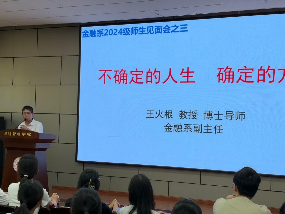 金融学专业负责人王火根教授从四年目标的问题出发,为不同方向的员工指明努力的方向,向同学们强调要在不确定的人生中寻找确定性,主动寻找并把握自己的方向,指出寻找确定性分三步走,第一步“立志,确定方向”,强调立志的重要性。“志不立,如无舵之舟,无衔之马”;第二步“知己知彼”从“知”中的“理、器”两方面入手强调要在修炼自身心性的同时,加强对各种学科技术的学习,第三步“行则将至”,用“道虽迩,不行不至,事虽小,不为不成”指出行动的重要性,并针对如何去“行”传递了独家方法。王老师鼓励同学们积极思考,进行职业规划,不断利用互联网资源充盈己身,避免纸上谈兵。