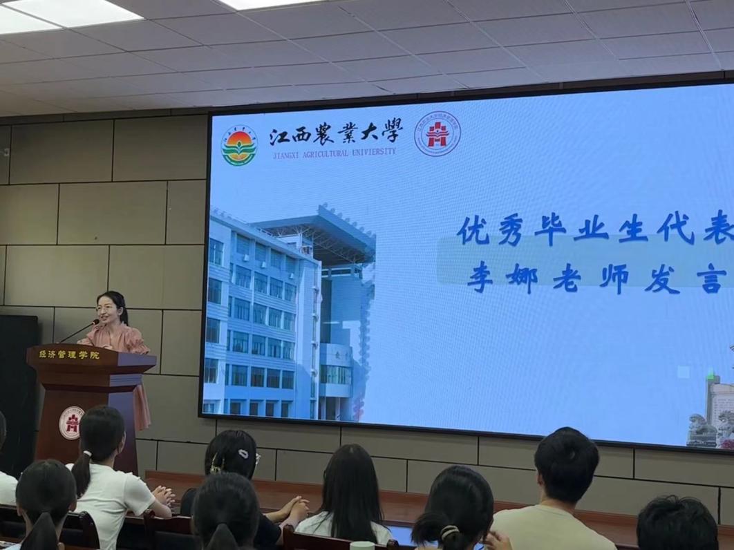 从农大出发又回归农大的2011届毕业生李娜,从员工角度出发以自身金融1103班为例子,从考研升学率,本班同学在各行业机关的就业情况两个方面为新生进专题分享。并指出希望24级新生们重视学习,以学业为本,学会独立自主思辨问题并跨界学习,始终保持对学习的热爱,不负自己,不负将来。李娜将自身的经验和感悟告诉新生并点明“现在的处境取决于过去的决定,未来所有的期待都在路上”。愿24级的新生们也能在自己的道路上熠熠生辉。最后,来自金融2203班的在校生代表徐欣然、金融2401班的新生代表廖雯纯同学作交流发言。