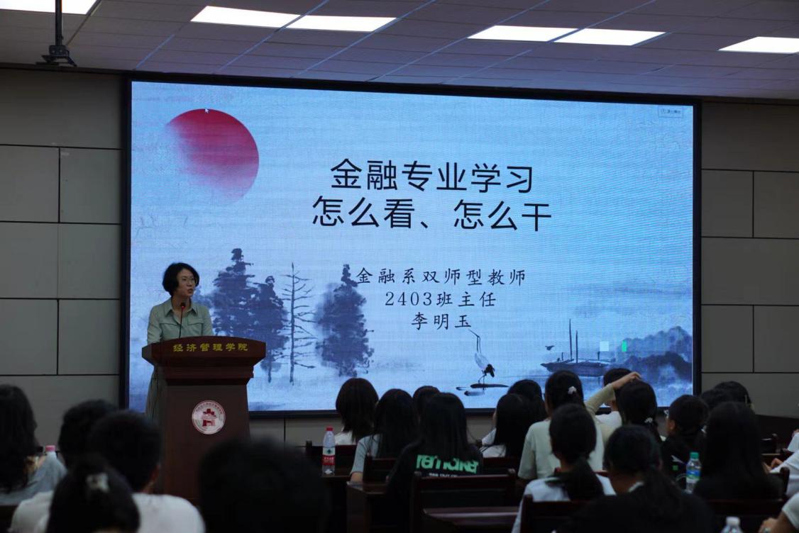 金融2401班主任李明玉从四个方面为新生们介绍怎么看待金融学,怎么学习金融学。“以史为鉴,金融强国”,金融的重要性对人类发展的重要性不言而喻,李明玉老师将寓言故事和专业术语结合,在点明金融学核心问题的同时为新生的金融学开端进行了启蒙,打造金融学基础。