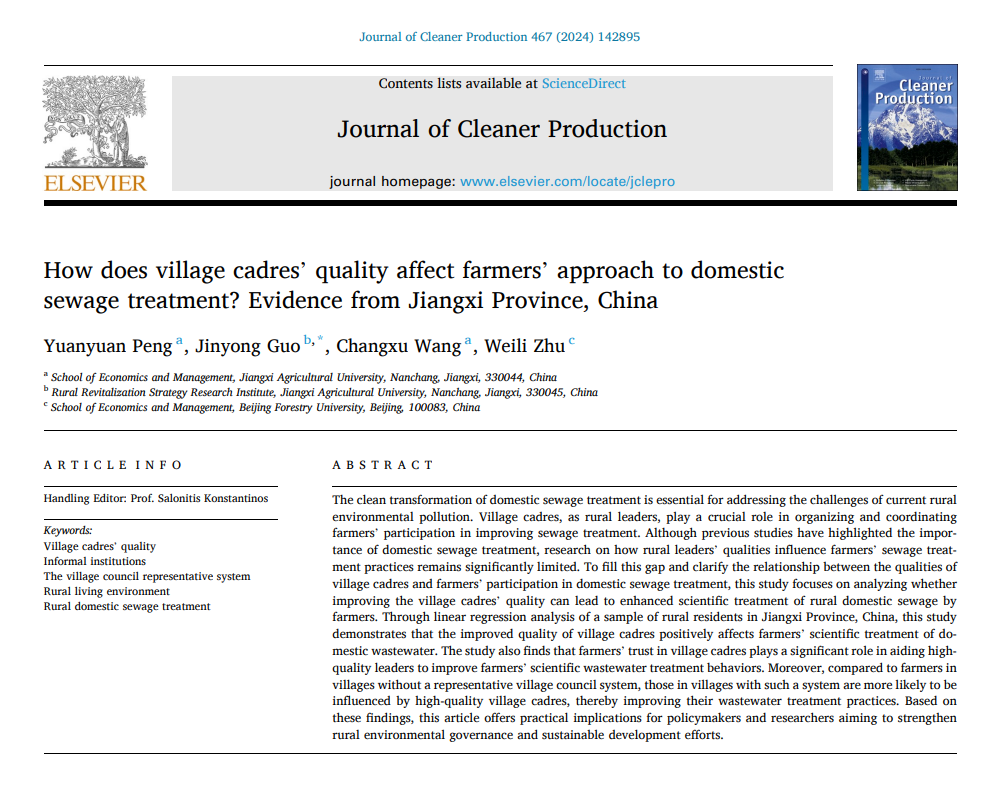 论文信息:PENG Y, GUO J, WANG C, et al. How Does Village Cadres' Quality Affect Farmers' Approach to Domestic Sewage Treatment? Evidence from Jiangxi Province, China [J]. Journal of Cleaner Production, 2024: 142895. https://doi.org/10.1016/j.jclepro.2024.142895.