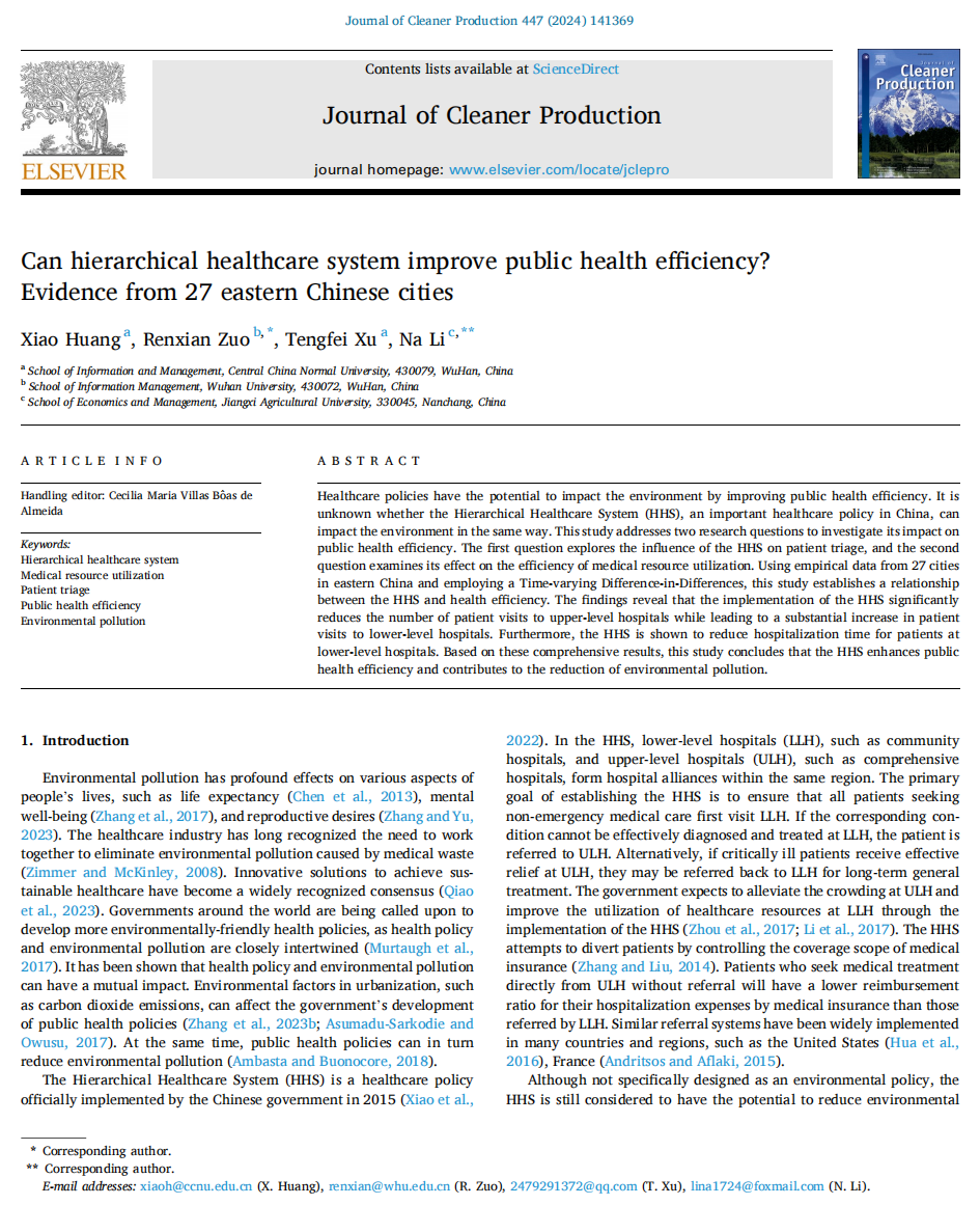 Please cite this article as: Huang X, Zuo R, Xu T, Li N. Can hierarchical healthcare system improve public health efficiency? Evidence from 27 eastern Chinese cities[J]. Journal of Cleaner Production, 2024: 141369. https://doi.org/10.1016/j.jclepro.2024.141369