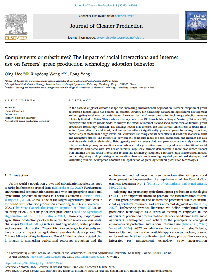 引用格式:Liao, Q., Wang, X., Yang, R., 2025. Complements or substitutes? The impact of social interactions and Internet use on farmers' green production technology adoption behavior. J Clean Prod. 518, 145964. https:// doi.org/10.1016/j.jclepro.2025.145964.