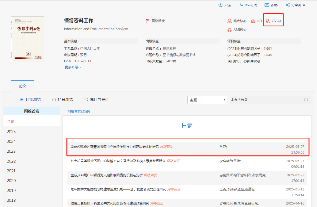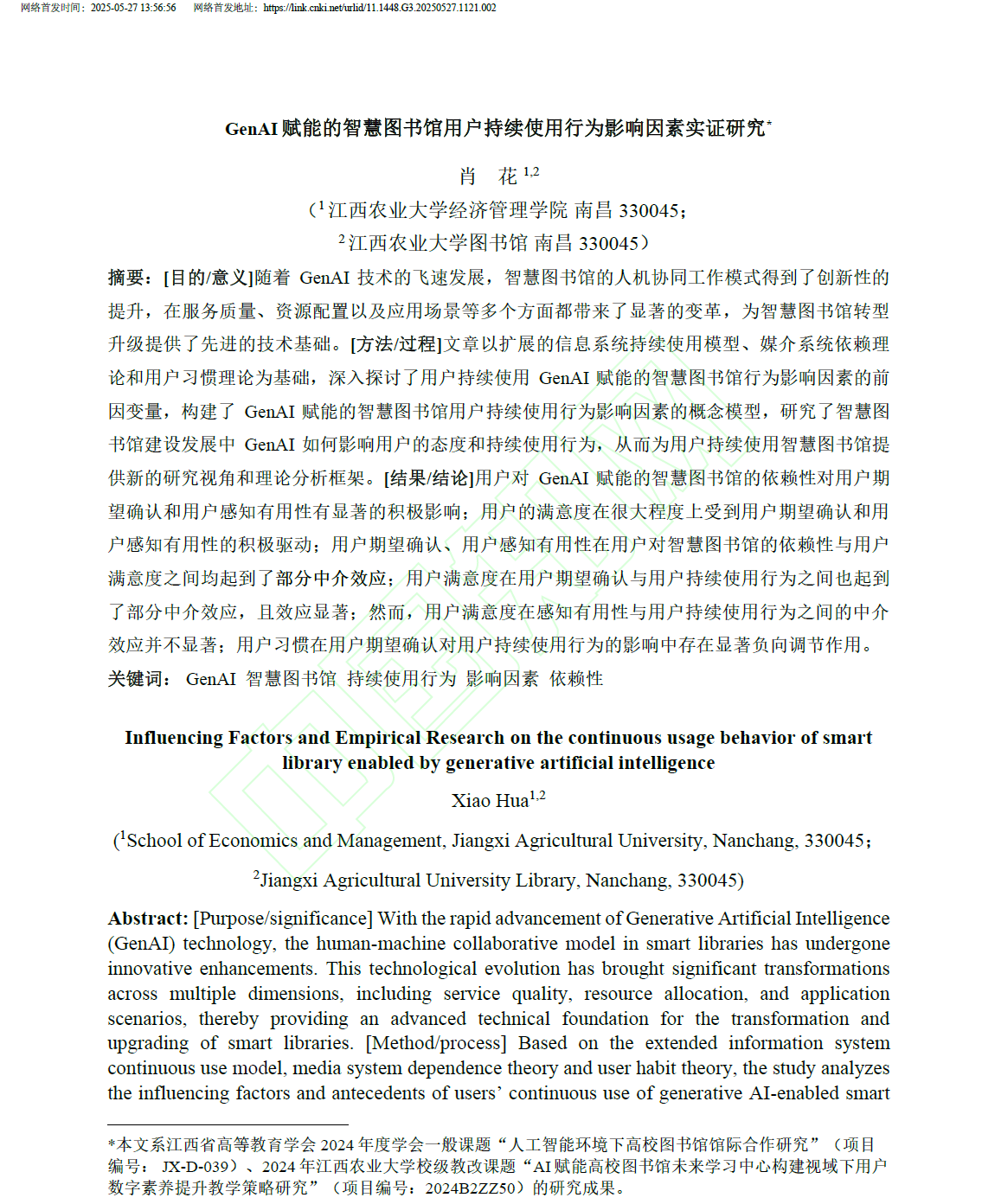 近日,CSSCI来源期刊《情报资料工作》发表了“GenAI赋能的智慧图书馆用户持续使用行为影响因素实证研究”一文,作者为BB贝博艾弗森博士后肖花。