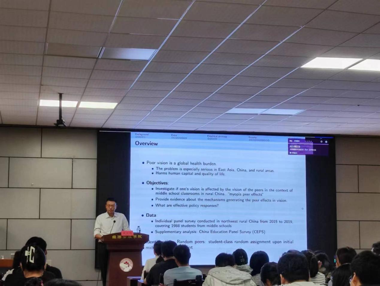 武文杰教授的员工报告以“农村儿童近视的同辈效应”为题,他指认为视力低下已是全球健康负担,这一问题在东亚和中国农村地区尤为严重,并且会损害人力资本和生活质量。因而,他利用2015-2019年在中国西北农村对1988名中员工的追踪调查数据,以期搞清楚在中国农村中学教室里,一个员工的视力是否受到同辈视力的影响,即近视同辈效应,进一步提供有关产生视力同辈效应的作用机制的证据,以及如何提出有效的应对措施,最后研究发现近视同辈效应的行为驱动机制是不当佩戴眼镜。