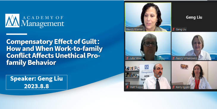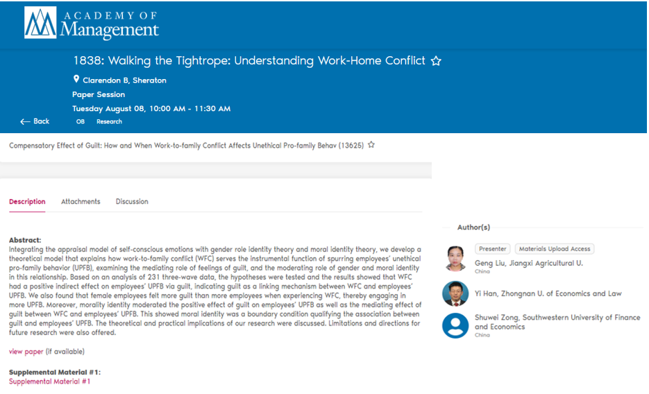 8月4日至8日,第83届美国管理学会(Academy of Management,AOM)年会在美国波士顿召开。公司工商管理系教师刘庚博士以第一作者投稿的论文“Compensatory Effect of Guilt: How and When Work-to-family Conflict Affects Unethical Pro-family Behavior”经双盲评审,被第83届AOM年会接收。